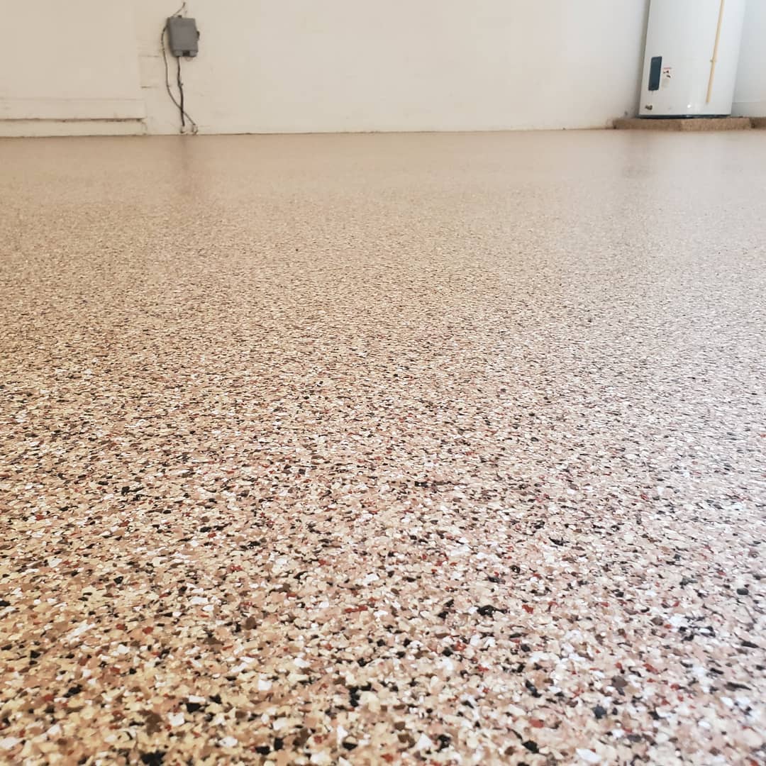 A multi-layered system comprising an epoxy base coat and vinyl flake chips, sealed with either a quick-drying polyaspartic topcoat or a polyurethane topcoat. This system is water and weather-resistant, chip, scratch, chemical and stain-resistant. Ideal for use in residential garages, outdoor surfaces and in busy commercial settings.
